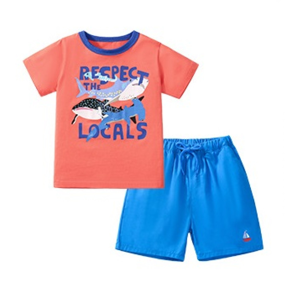 Деталі: футболка прикрашена оригінальним принтом із зображенням акул та життєстверджуючим написом «RESPECT THE LOCALS», а на шортах є акуратна нашивка у вигляді вітрильника, що надає образу завершеності.